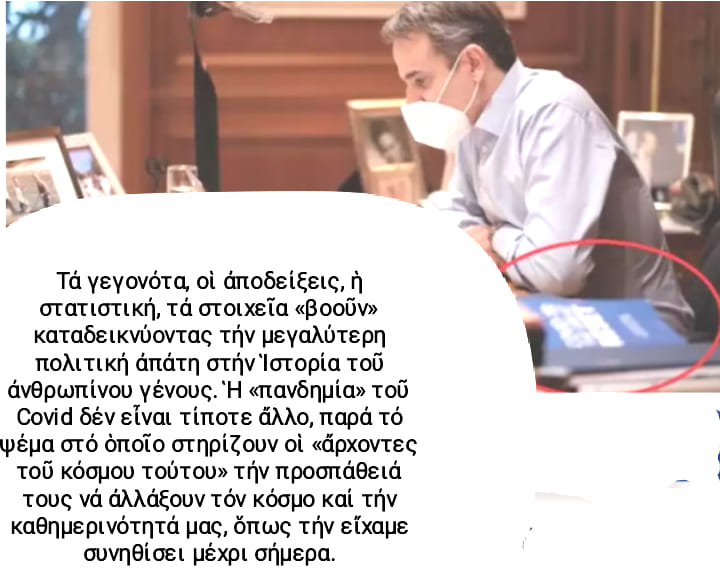 Τό βιβλίο «COVID-19: The Great Reset» σκόπιμα ἤ μή, ἐμφανίζεται σέ δύο διαφορετικές χρονικές στιγμές, τοποθετημένο πάνω στό γραφεῖο τοῦ πρωθυπουργοῦ, Κυριάκου Μητσοτάκη.